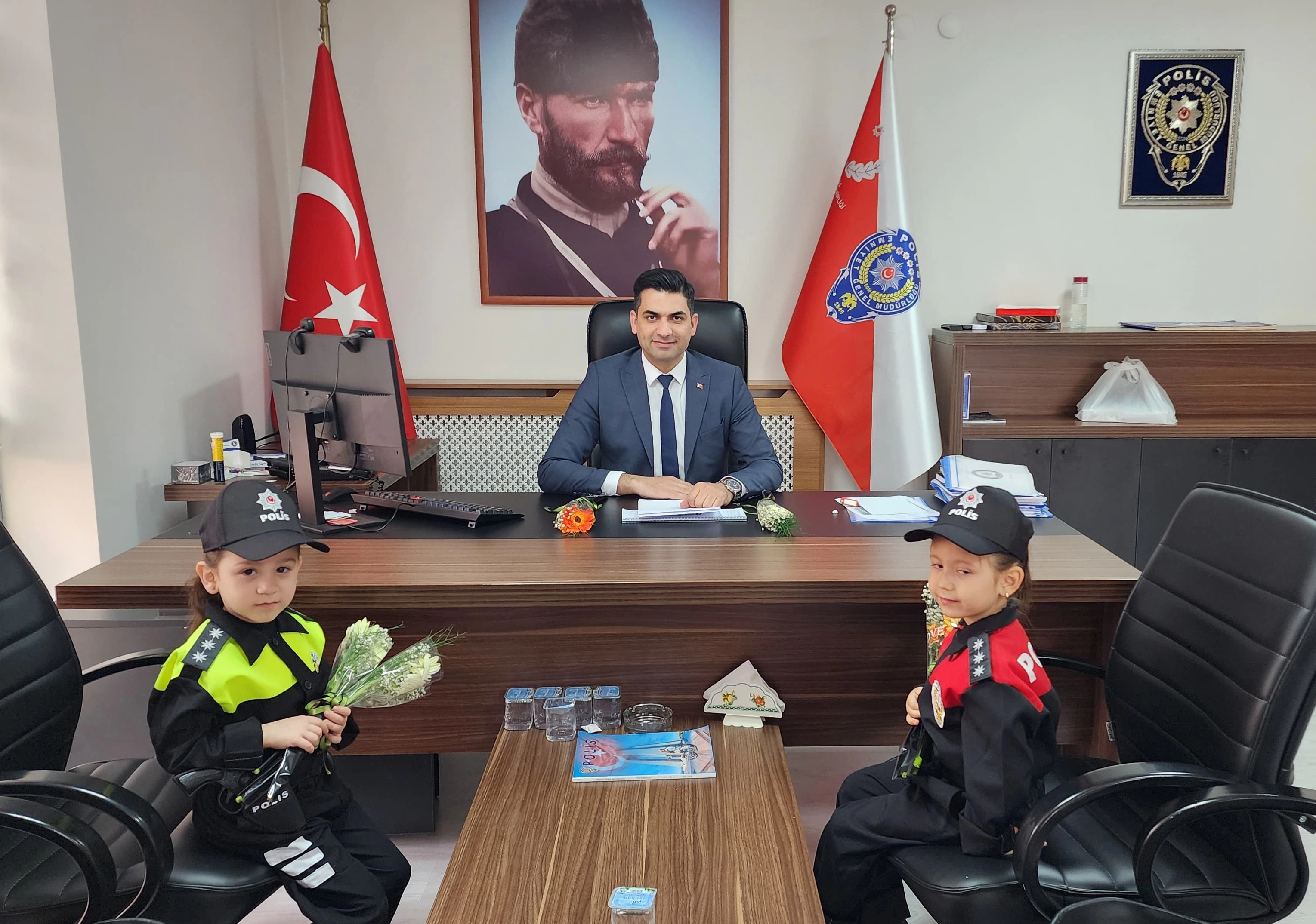 Küçük kızlar, polislerin günlerini kutlamak amacıyla Emniyet Amir Vekili Komiser Adem Çiçeksöğüt’ü makamında ziyaret etti. Ziyaret sırasında minikler, ellerindeki çiçekleri polis amcalarına takdim etti. Emniyet Amir Vekili Komiser Adem Çiçeksöğüt, miniklerin naif ve içten ziyaretinden büyük mutluluk duyduğunu ifade etti.